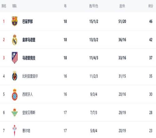 在积分榜上,巴萨以46分排名榜首。第2名的是皇马,战绩是42分。前2的差距只有4分,巴萨占据优势。马竞赢球之后,总积分是37分,比巴萨少了9分,冲击冠军希望比较渺茫。比利亚雷亚尔依然是35分,排名第4。第5的是西班牙人,拿到30分。皇家贝蒂斯以28分排名第6。